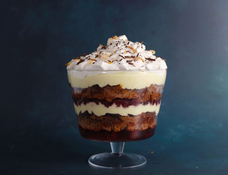 Layers of chocolate pound cake, custard, tinned fruit, Jell-O if you dare, and clouds of whipped cream. The higher it tips, the bigger the laughs.